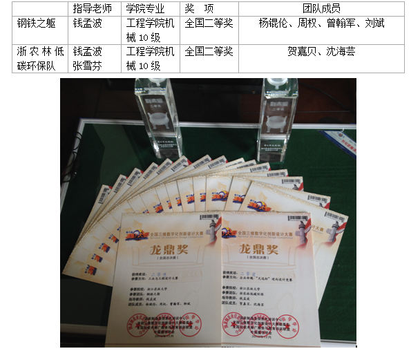 第六届全国三维数字化创新设计大赛(简称全国3D大赛)全国现场总决赛于2013年12月8日在江苏省常州市科教城拉下帷幕,学生代表队夺得获得全国二等奖2项。本次大赛有机械学科青年教师钱孟波、张雪芬老师指导,院长金春德教授担任答辩顾问。此前学生代表队夺得浙江赛区特等奖1项,一等奖3项,二等奖6项。我校获得浙江赛区优秀组织奖。